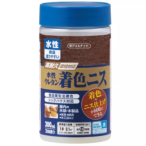 水性オイルステインであり、希釈して使用するため好みの色味まで調整することができます。重ね塗りすると更に味のあるデザインとなります。木目もキレイに浮き出せて、色付きニスを塗るよりも仕上がりは美しいです。