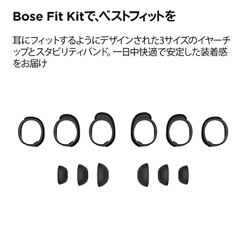また、耳にぴったり合うように、3サイズのイヤーチップとスタビリティバンドが付いています。イヤホンがなかなか耳に合わなくお悩みの方は、ぜひこちらを試してみましょう。