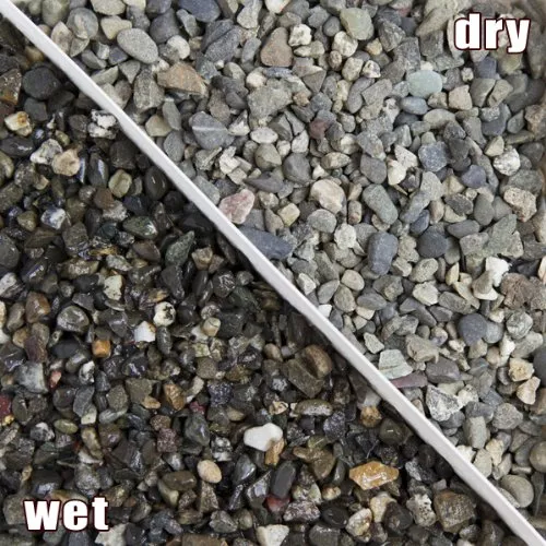 グレーの中にシックな茶色や黄色が混ざっているのが特徴の金華砂利です。水に濡れるとツヤが出て、黄色と黒のコントラストがはっきりとしたエキゾチックな色合いに変わります。