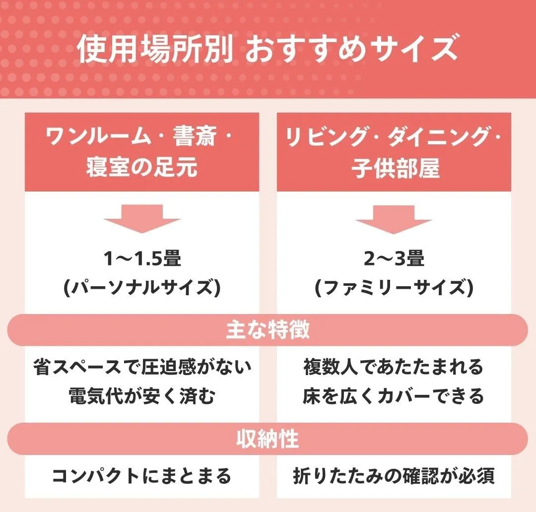部屋の広さや家具の配置に合わせ、最適な面積を選ぶ作業は非常に重要です。利用者が床に座る範囲を正確に把握することで、無駄な電力消費を抑えつつ、快適な暖房環境を構築できます。一人暮らしから大家族まで、多様な生活スタイルに即した大きさを選定するための具体的な基準を詳しく解説します。