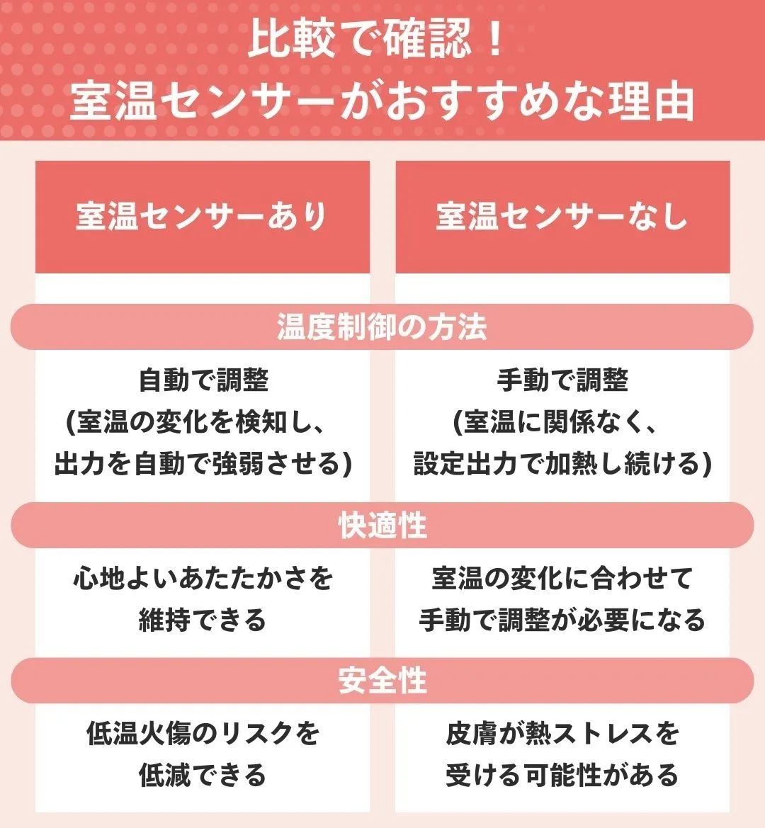 効率的な温度制御は、肌への乾燥を和らげる効果も期待できます。一定の温度を保つ安定した制御により、身体に急激な熱ストレスを与えず、自然な暖かさを維持できる点が魅力です。冬場の冷え込みが激しい地域や、断熱性の低い部屋で使用する場合、センサーによるきめ細かな出力調整機能は、快適性と経済性のバランスを保つ上で重要な役割を果たします。長く使い続けるものだからこそ、知能的な制御機能を重視することが賢明な選択となります。