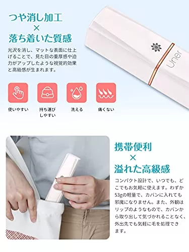 水なしですっきり剃れる産毛・眉用シェーバーです。密着スイングヘッドを搭載しており、顔の凹凸に合わせてヘッドが動きます。丸い刃先が肌に優しい設計で、軽量コンパクトなので持ち運びにもぴったりです。