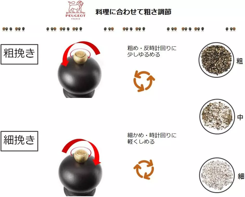 ペッパーミルは、そのとき胡椒を何に使うかによって、挽き具合を調節ができると便利です。料理の下ごしらえや味付けの際にはできるだけ細かくしたり、料理の仕上げの際には粗くしたり、挽き具合を調節できるタイプがあります。