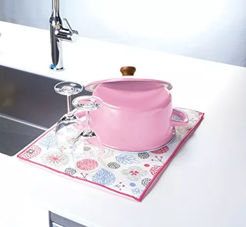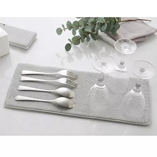 商品名の通り、食器拭きにもなる水切りマットです。極細繊維「ベリーマ」を独自の編立で段ボール状に厚みをもたせ吸水性と速乾性にすぐれています。柔らかな素材でクッション性もあるので食器を傷つけません。