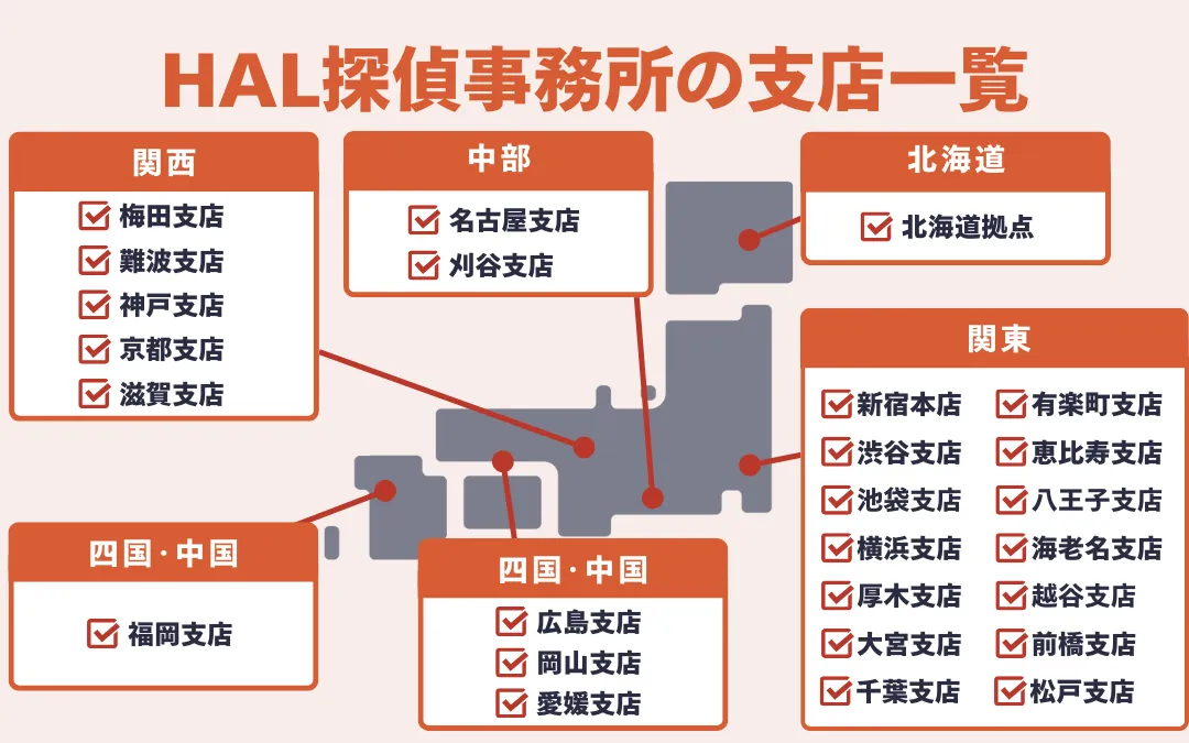 HAL探偵社は東京新宿区の本社をはじめ全国に26箇所の支店を展開しており、最短で即日対応が可能です。料金体系は全国一律で、地域による調査費用の差がない点も大きな魅力です。また出張費用も全国どこでも0円で、追加料金が一切発生しません。各地域の土地勘に詳しい調査員が対応するため、単身赴任中の浮気調査や不倫旅行の調査を検討している方には特におすすめです。