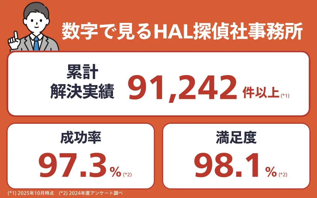 HAL探偵社は2012年の設立以来、2025年10月までに累計91,242件という圧倒的な解決実績を誇り、豊富な経験と確かな実績で高い信頼を得ています。