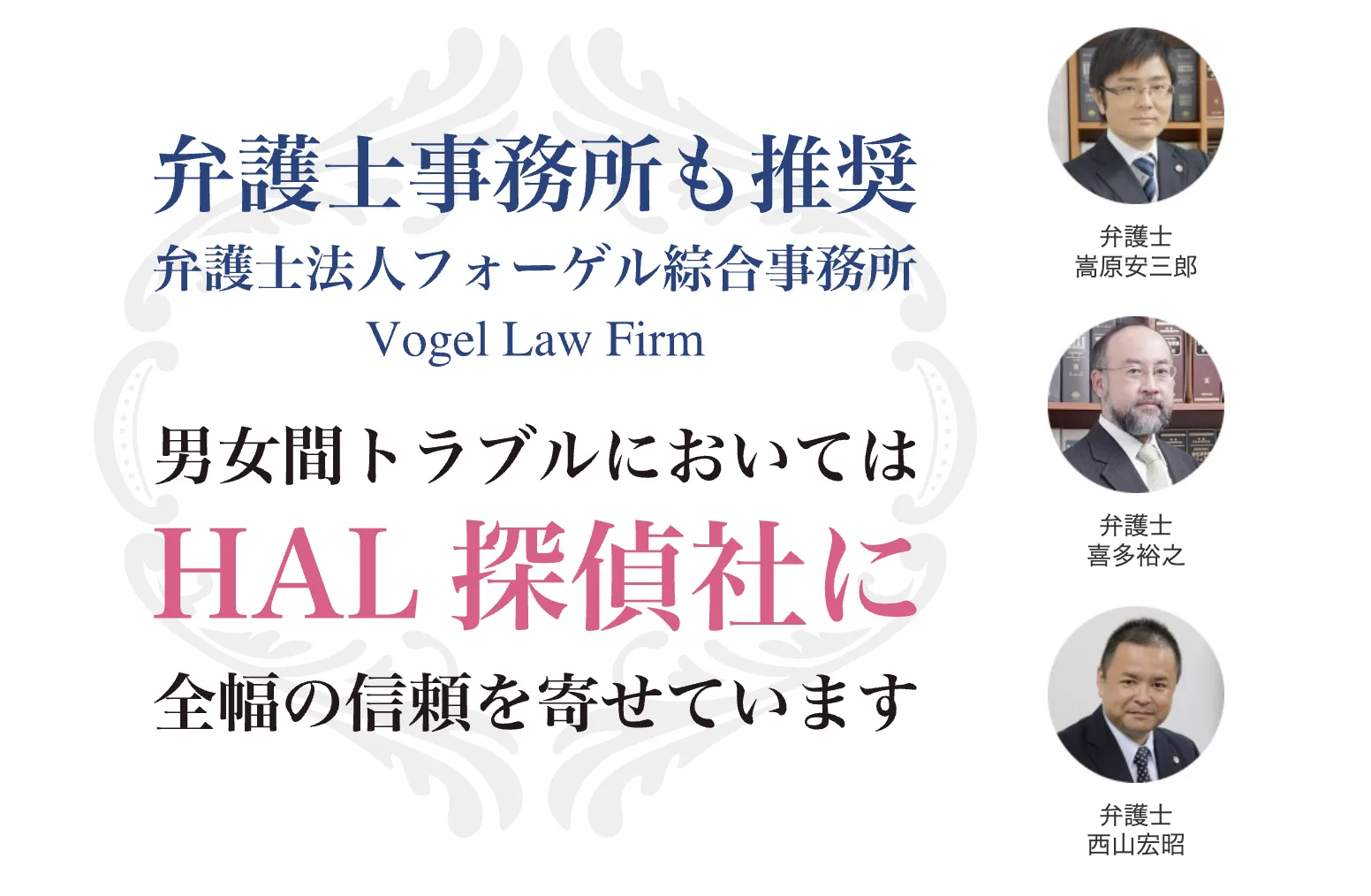 さらにHAL探偵社では、アフターフォローとして慰謝料請求や離婚を検討される際に、弁護士法人フォーゲル綜合法律事務所をはじめとした提携弁護士事務所を無料でご紹介しています。こうした充実したサポートもHAL探偵社の大きな魅力です。