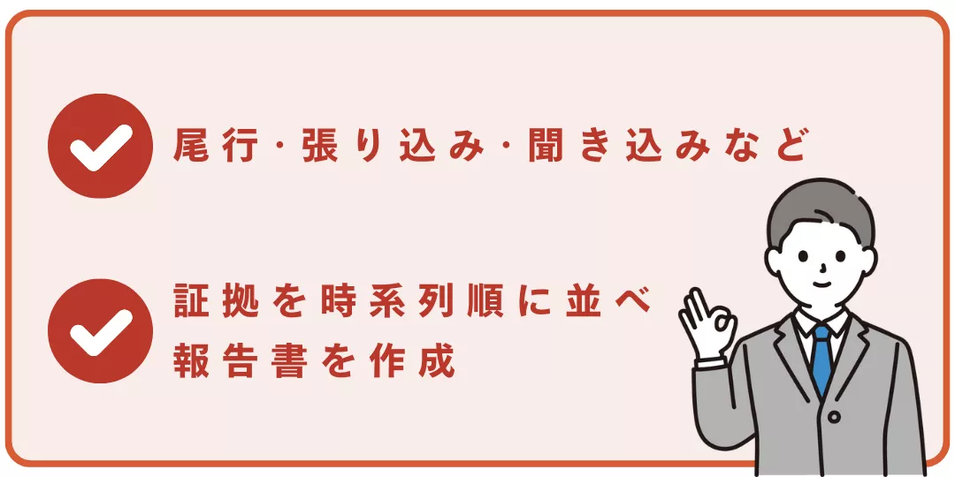 対象者の尾行、張り込み、聞き込みを始めとする素行調査を行います。そして対象者がいつどこで誰と会い何をしていたのかを証拠(写真や動画)共に報告書にまとめます。