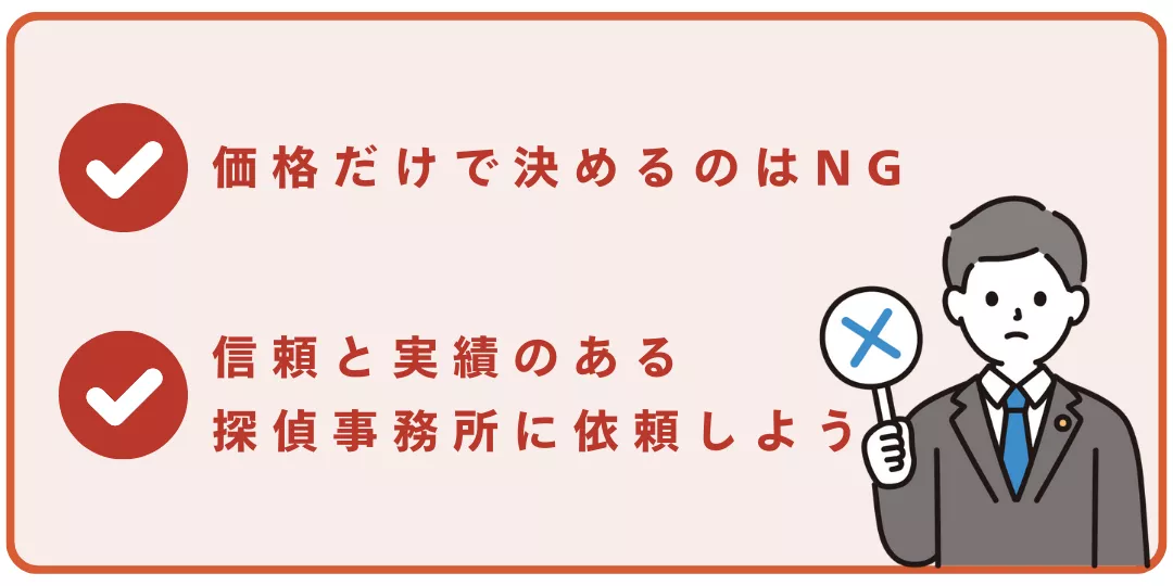 一概に依頼料が安い探偵事務所が悪い訳ではありませんが価格だけで探偵事務所を決めるのは危険です。経験の少ないスタッフが担当につき十分な証拠が取得できない可能性もあります。
