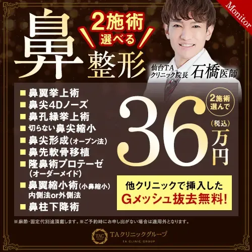 TAクリニック仙台院で石橋院長指名限定で、好きな鼻整形を2施術で36万円で受けられるキャンペーンを実施しています!