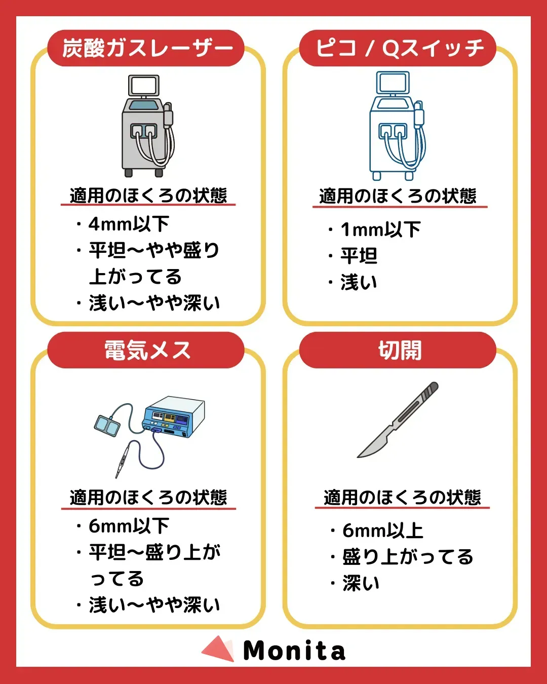 ほくろ除去の施術は主に4種類に分かれ、ほくろの大きさ・盛り上がり方・深さ※などの状態で適用が分かれます。