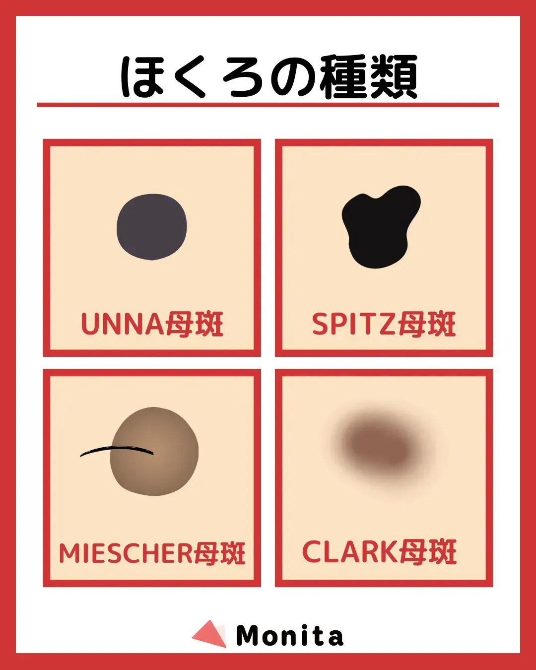 母斑細胞が皮膚の最表面の表皮・中間の真皮境界・表皮の下の真皮のどこまで到達しているか