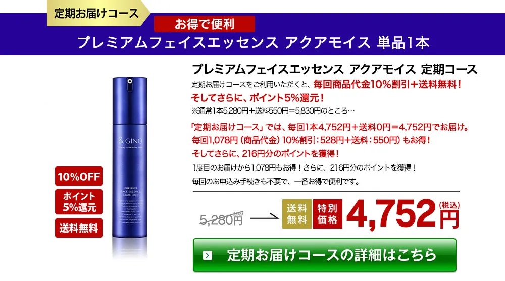 アクアモイスは公式ホームページから購入する方法が一番お得です。初回から10%OFFの4,742円で購入できます。1日2回朝と晩で使ったとしても約2か月使えるため、1日たったの約40円しかかかりません!