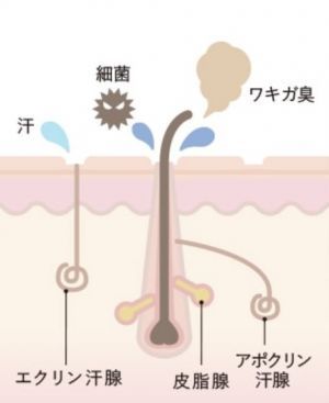 汗を出す汗腺には、エクリン腺・アポクリン腺の2種類があります。ワキガのニオイの原因は主にアポクリン汗腺から出る汗です。実は汗自体は無臭。しかし、ここから出る汗は「タンパク質」や「尿素」が含まれ、それらが雑菌のエサとなり、独特なニオイを発生させます。