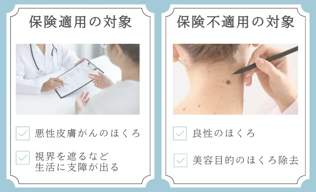 保険適用の対象となるのは、悪性の皮膚がん(メラノーマ)・生活に支障のあるほくろの場合のみです。