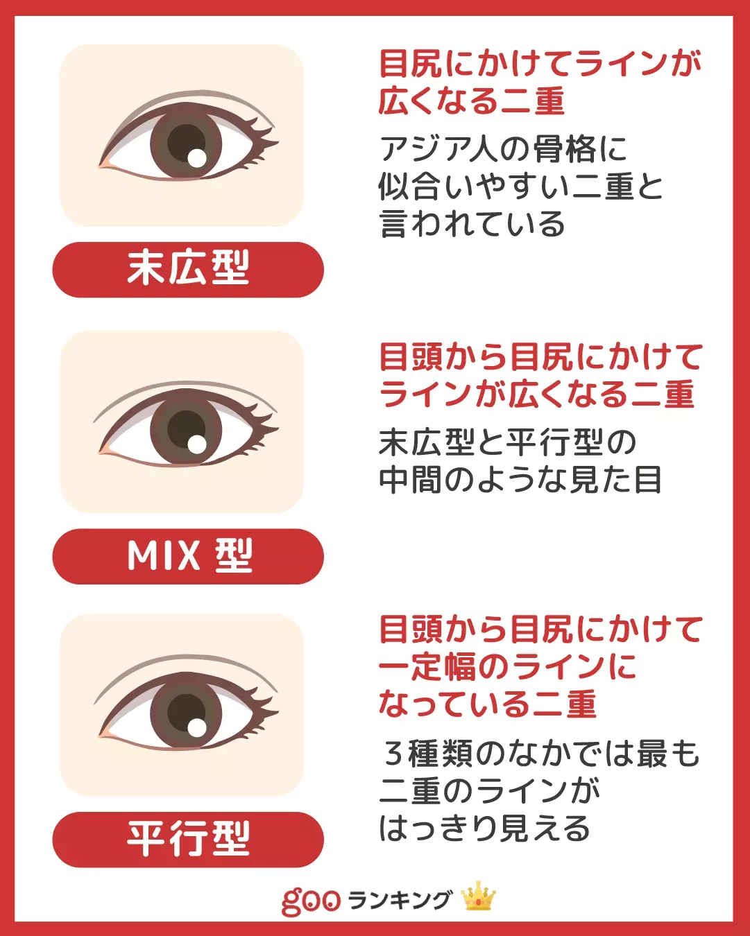 好みの二重が定まってない方は、末広型・MIX型・平行型から自分が理想とする二重ラインを検討してください。