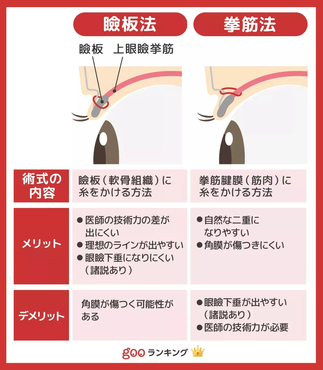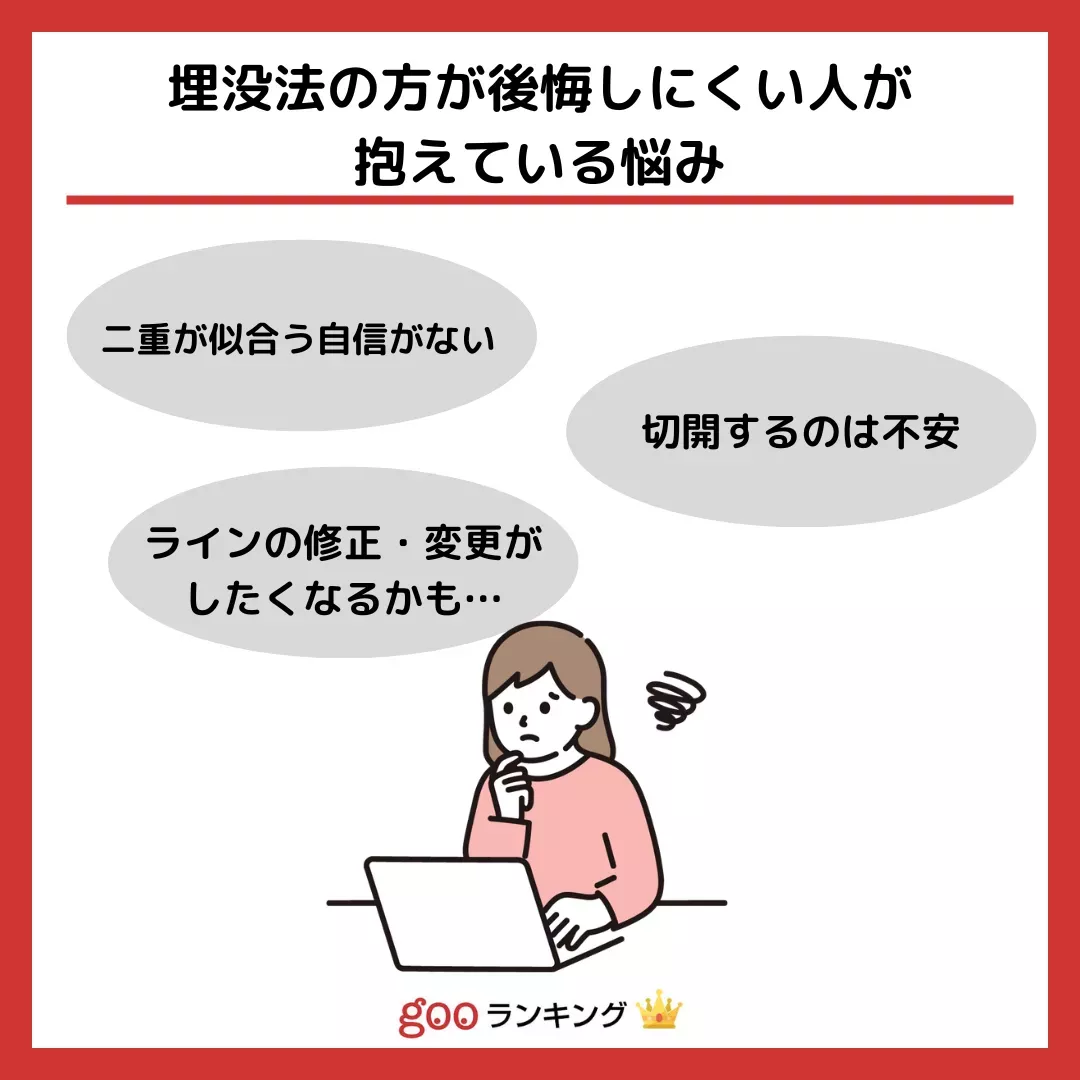 「二重が気に入らないかも」「変更がしたくなるかも」など、少しでも不安があるなら埋没法の方が後悔にくいでしょう。