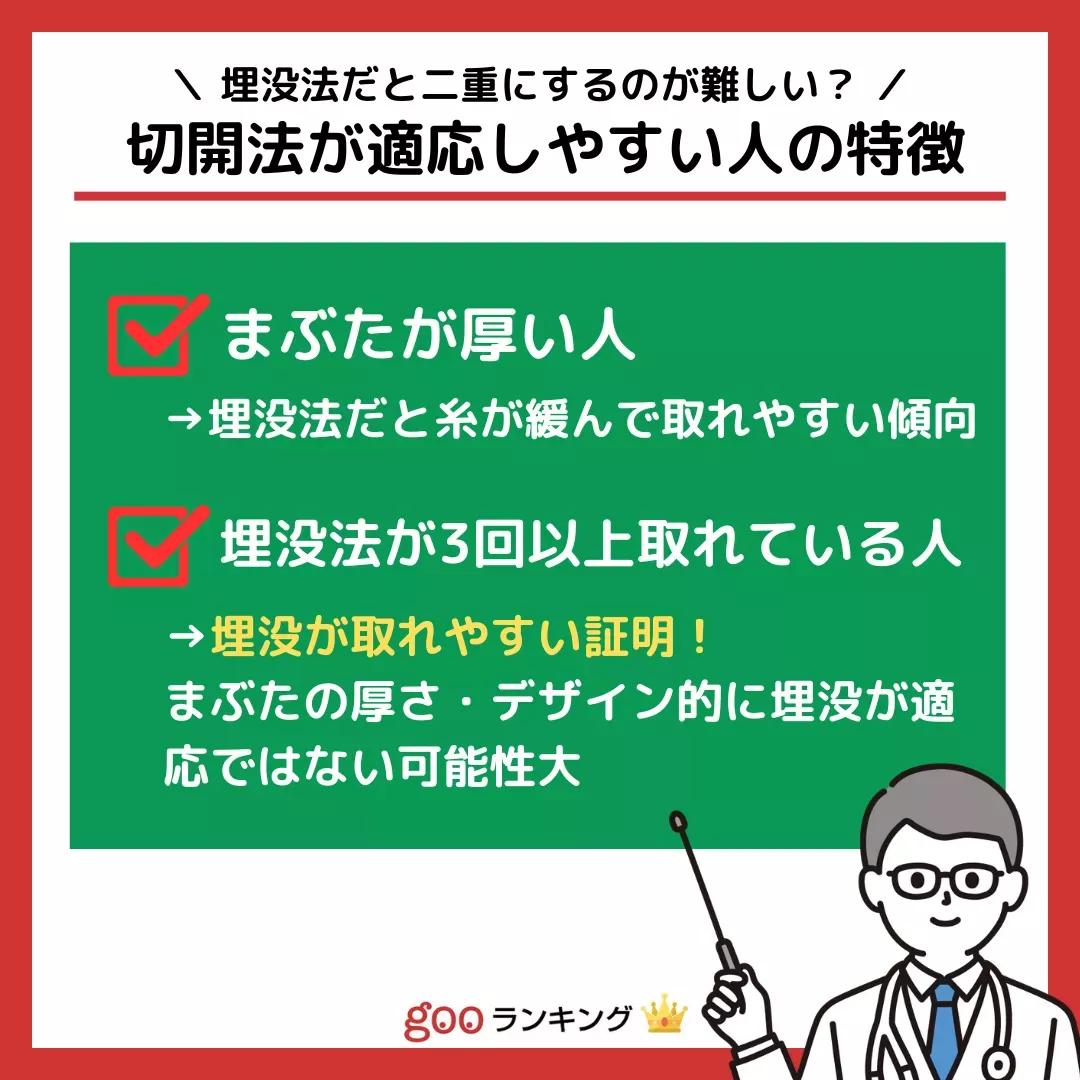 埋没法だと二重にするのが難しい特徴に当てはまっていれば、切開法が適応になります。