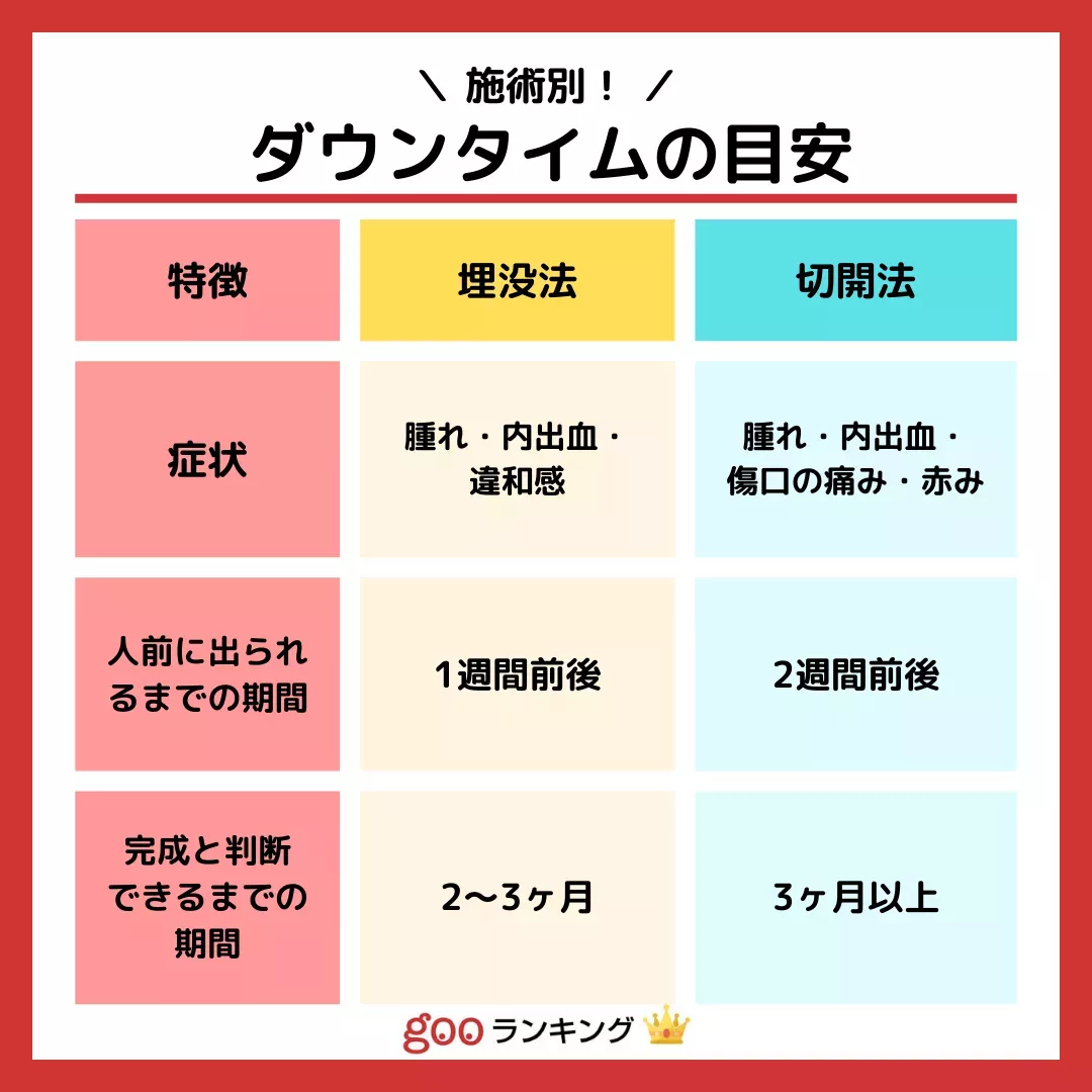 詳細は後述しますが、埋没法も切開法も症状や期間が違うだけで、ダウンタイムは基本的に出ます。