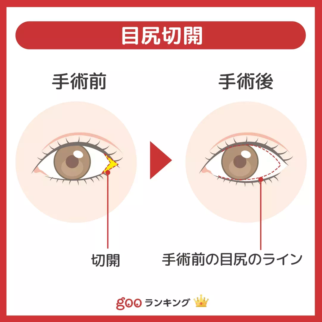 目尻切開とは、目尻のきわを切開して目の横幅を広げ、目を大きく見せる施術です。