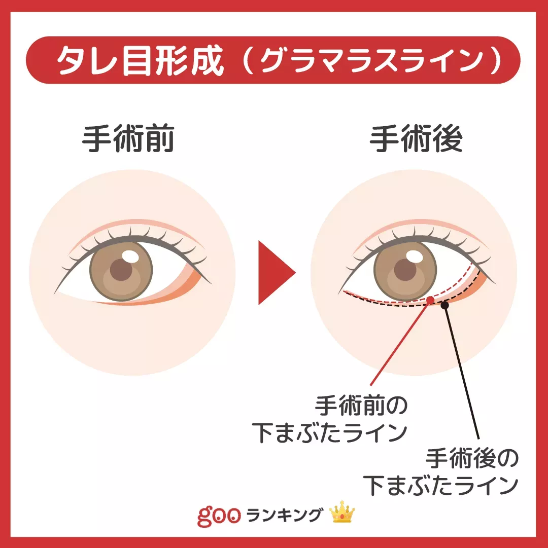 タレ目形成(グラマラスライン)は、下まぶたを引き下げて目を下に拡大させる施術です。