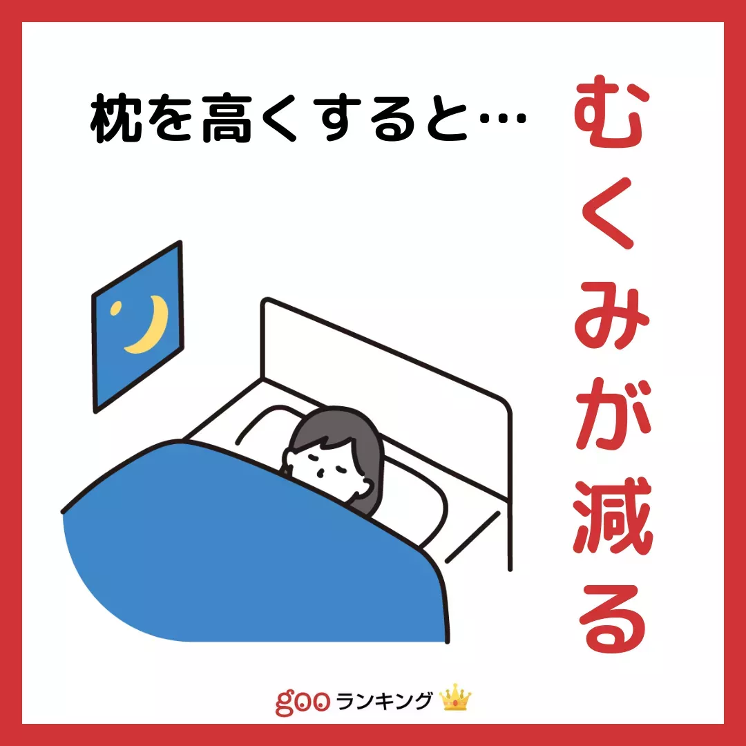 枕を高くすれば頭部の血流が少なくなり、まぶたに貯まる水分が減ってむくみが起きにくくなります。