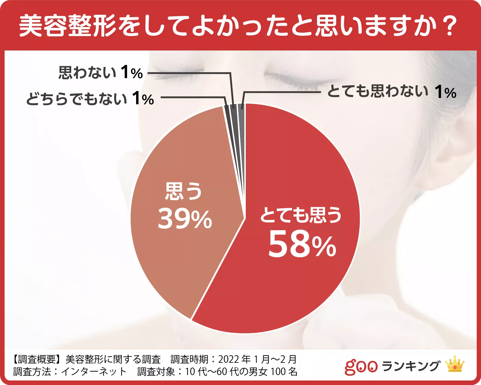 編集部が男女100名にアンケートを取った結果、97%が美容整形をしてよかったと回答しました。