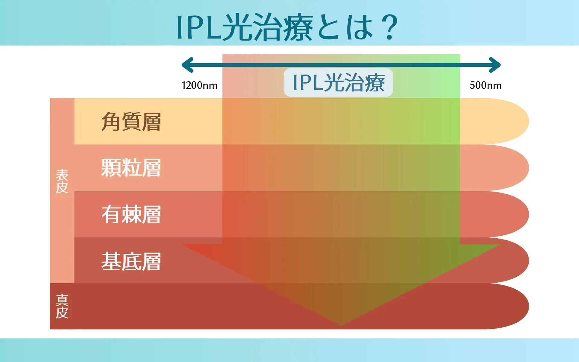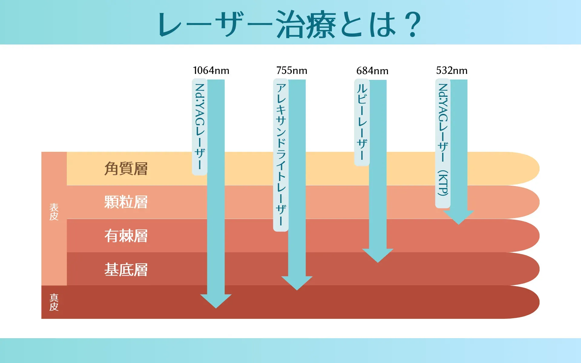 現在シミ取りレーザーとして使用されるレーザーは、いずれかの「波長(単位:nm)」を搭載しており、それによって肌のどこまでレーザーが届くかが決まっています。