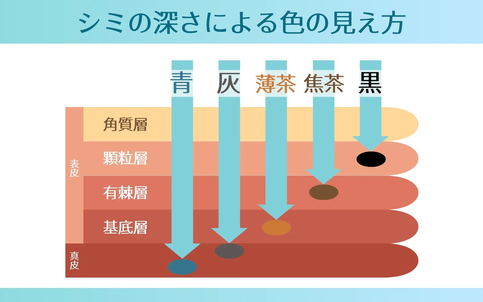 実はシミはメラニンが生成される肌の深さによって、色の見え方が変わります。