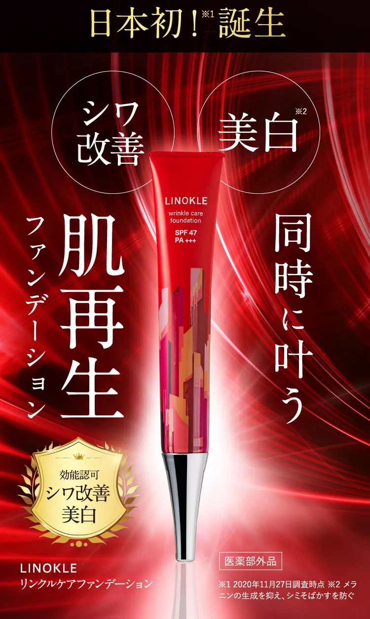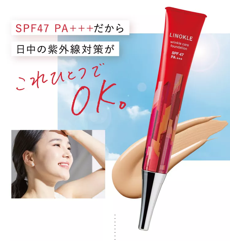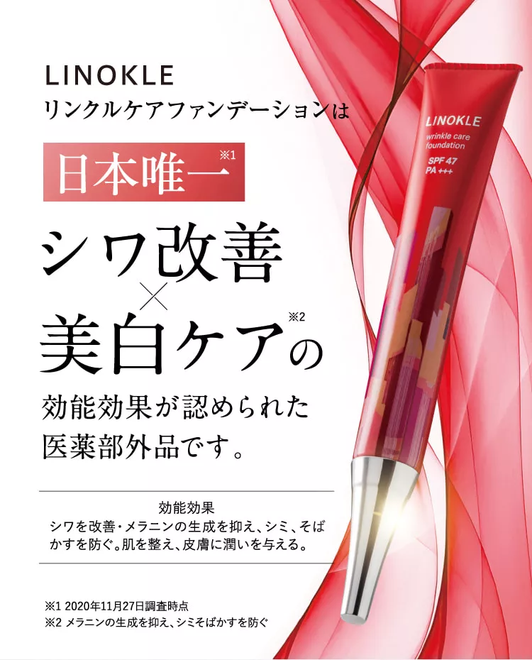 そんな悩みをもつ人にはリノクルがおすすめです。リノクルは期待のメーキャップ効果に加えスキンケアも同時にできるファンデーションです。乾燥によるシワや日焼けによるシミのケアに対応した成分*を配合した医薬部外品で、口コミでも高い評価を集めています。