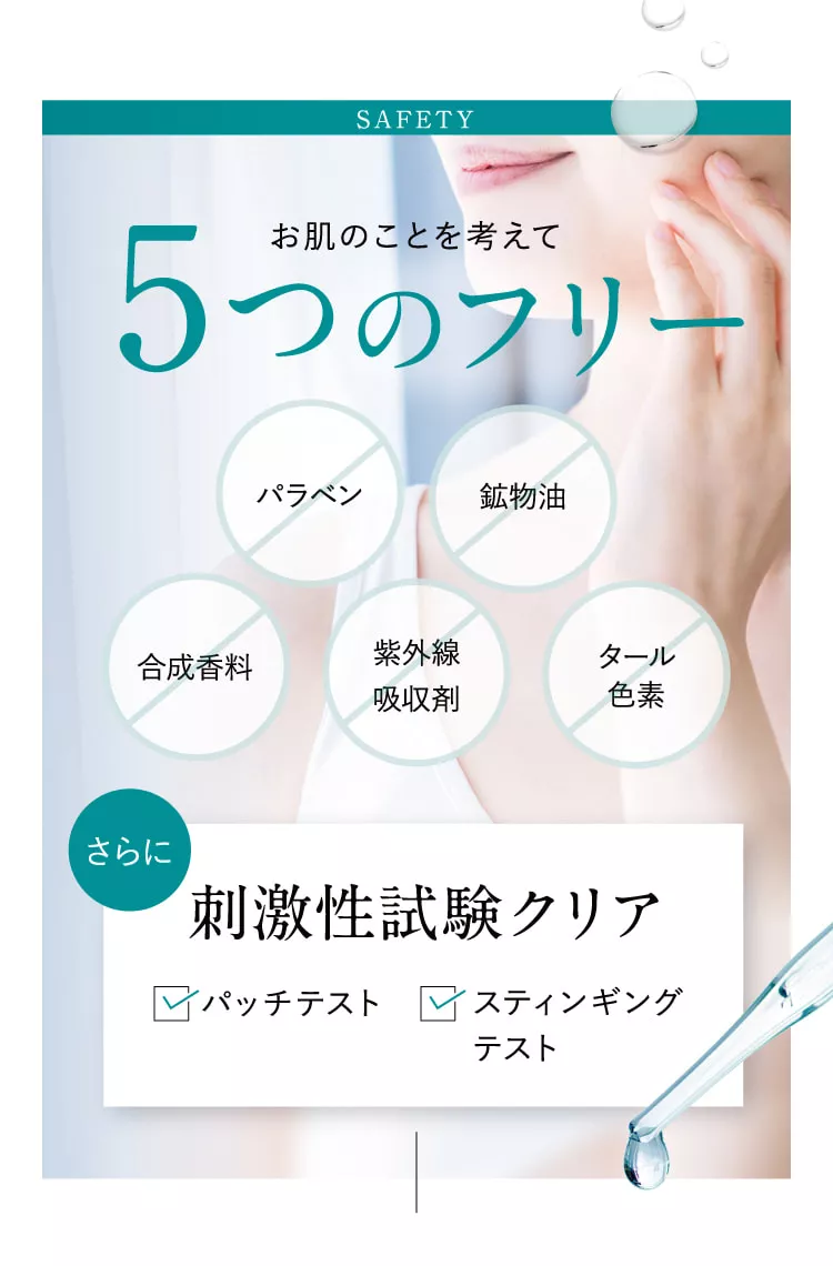 リノクルは肌に負担がかかる可能性が高い「パラベン・鉱物油・合成香料・紫外線吸収剤・タール色素」の5つの成分を使用していません。また、パッチテスト・スティンギングテスト(敏感肌対象のヒリヒリ感を評価)も実施しています。