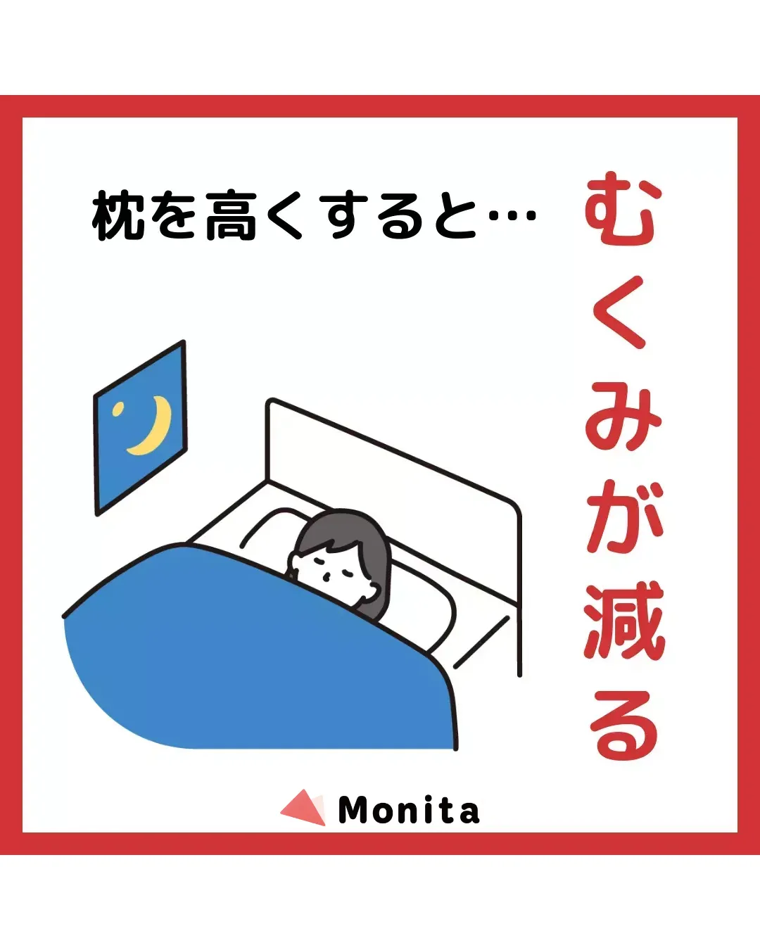 枕を高くすれば頭部の血流が少なくなり、まぶたに貯まる水分が減ってむくみが起きにくくなります。