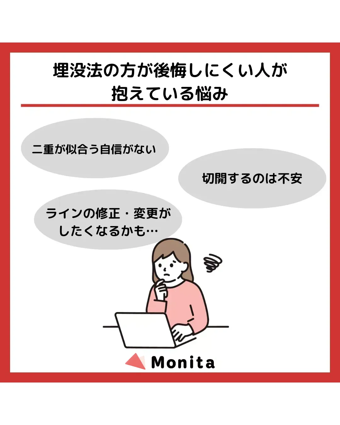 「二重が気に入らないかも」「変更がしたくなるかも」など、少しでも不安があるなら埋没法の方が後悔にくいでしょう。