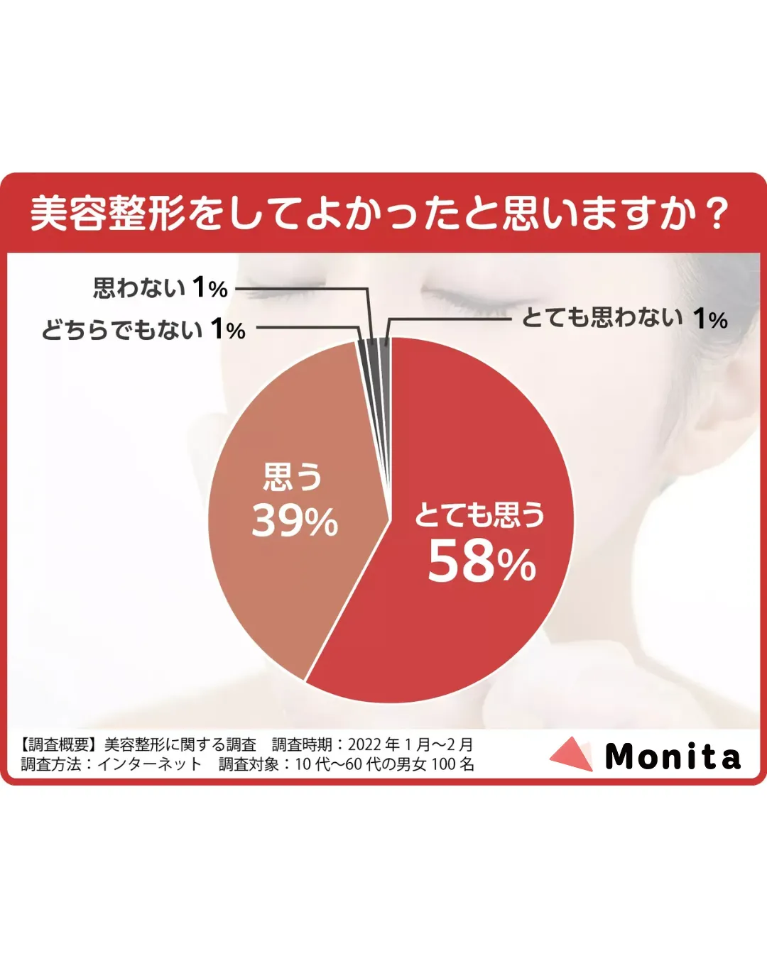 編集部が男女100名にアンケートを取った結果、多くの方が美容整形をしてよかったと回答しました。実際に美容整形をして後悔している人は少ないようです。