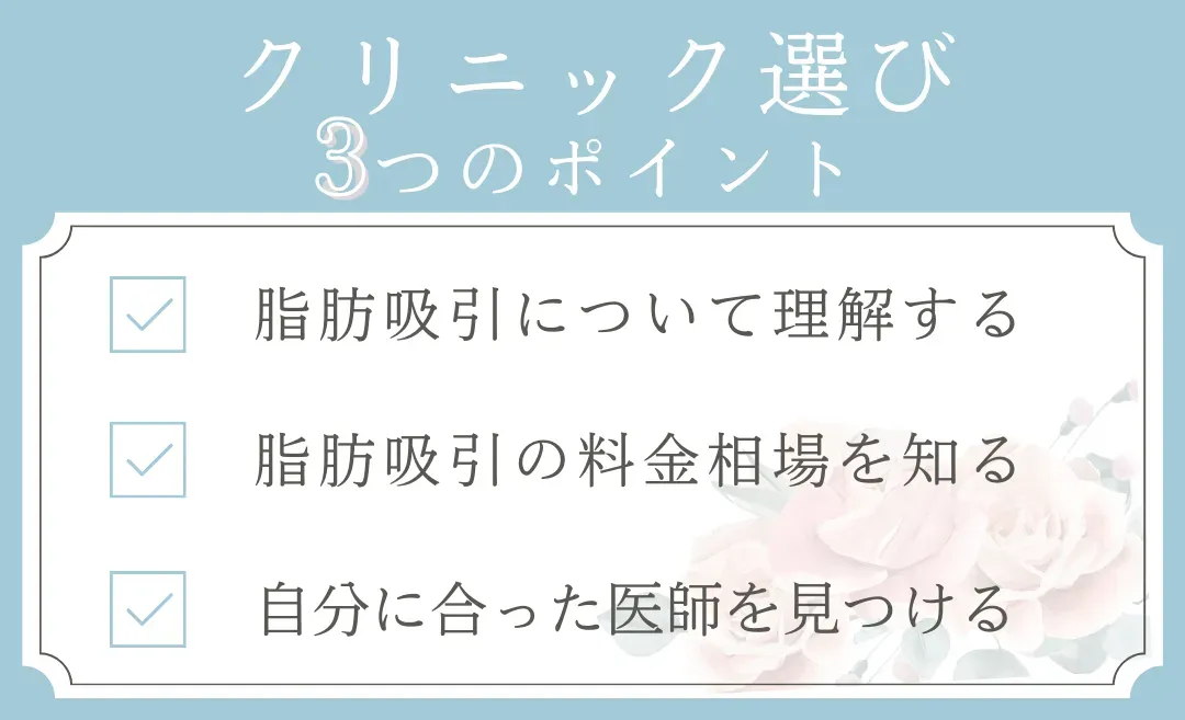 この記事では脂肪吸引ができるクリニック選びに失敗しにくくなるチェックポイントを3つご紹介します。