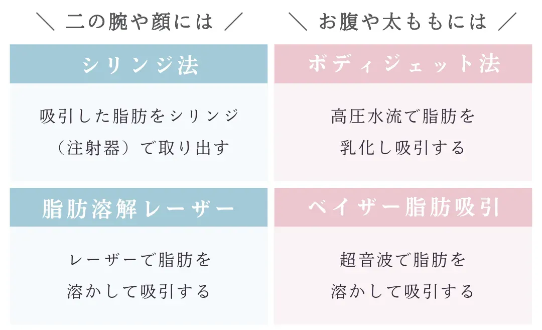 脂肪吸引は、実は術式・部位・除去する脂肪の量などによって、施術内容が大きく変わります。