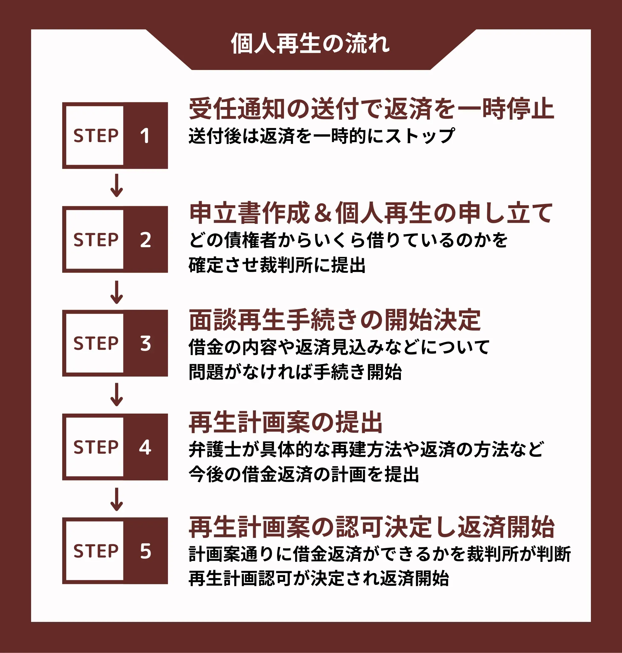 個人再生 | 自己破産よりも手続きのハードルが低く、借金総額が5,000万円以下(住宅ローンを除く)であれば利用可能。マイホームを手放さずに借金を大幅に減額できる。 |
