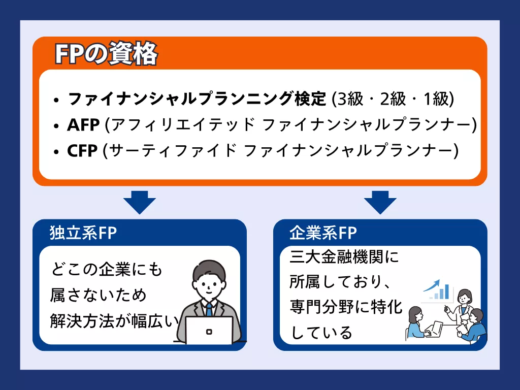 また、FPには独立系FPと企業系FPの2種類あり、それぞれに特徴があるので自分にはどちらが合っているか考えて選ぶようにしましょう。