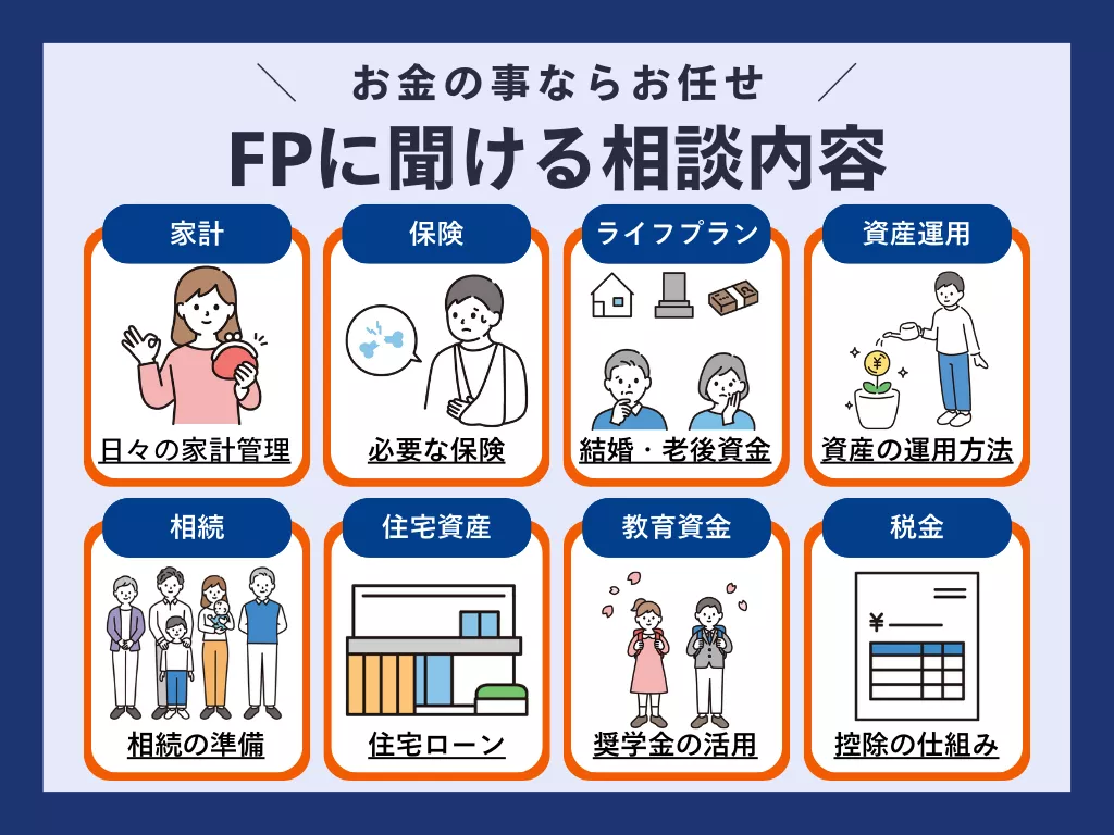 - 相談内容:家計見直し、保険、ライフプラン、資産運用、NISA、iDeCo、資産形成、相続、住宅ローン、教育資金、税金、介護準備