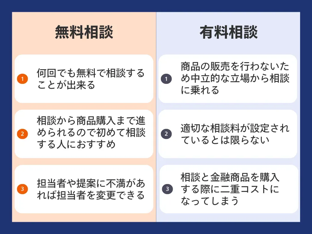 有料相談の特徴は、商品の販売を行わないため、完全に中立的な立場から相談に乗れるところです。しかし、適切な相談料が設定されているとは限らず、提案を実行することが出来ないので、商品選びや購入手続きを相談者自身で行う必要が出てきてしまい、初心者にはおすすめできません。