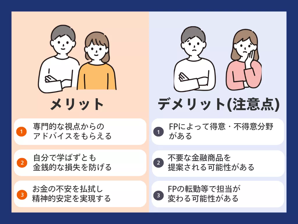 ここまでFP相談について詳しく解説しましたが、FPにお金の相談をするうえでメリットとデメリットを知っておきましょう。