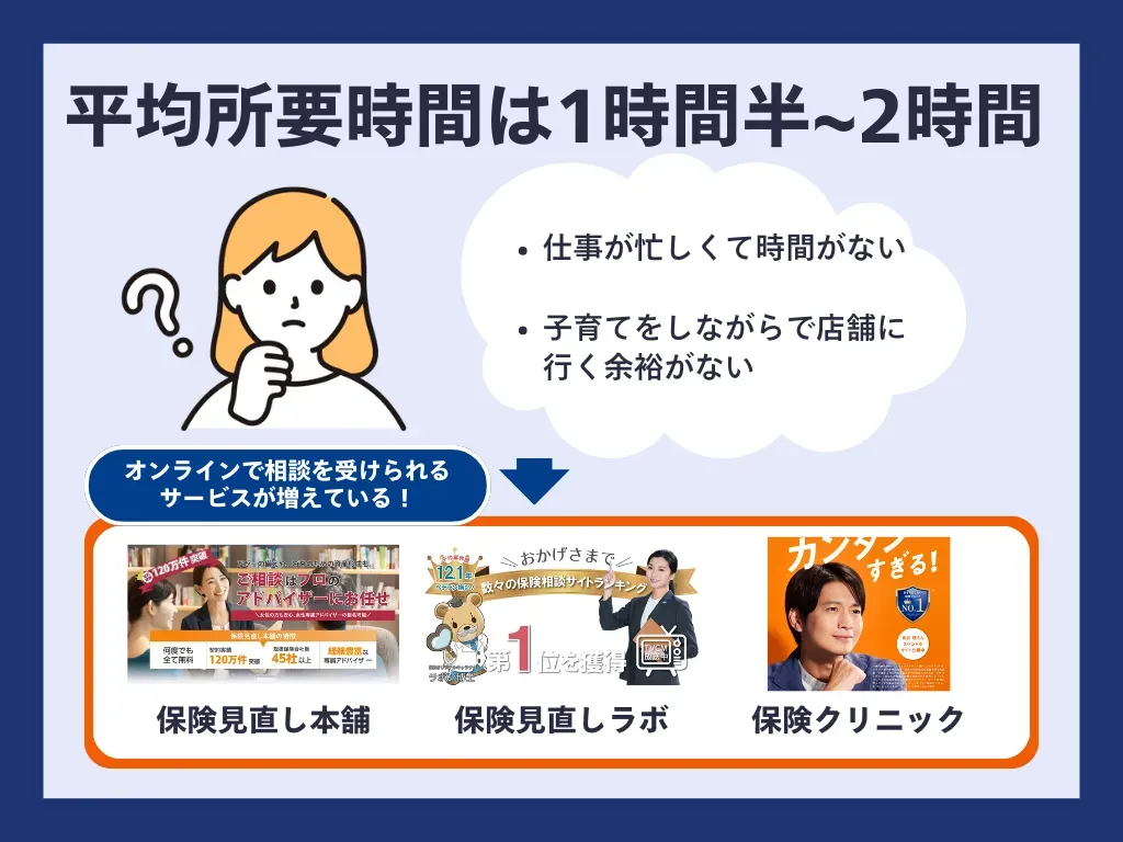 FP相談にかかる時間は平均1時間半~2時間と言われています。時間の確保が難しい場合は、事前に必要な情報を準備し、確保できる時間を伝えることで相談時間が短縮できる可能性があります。また忙しい場合にはオンライン相談も可能です。