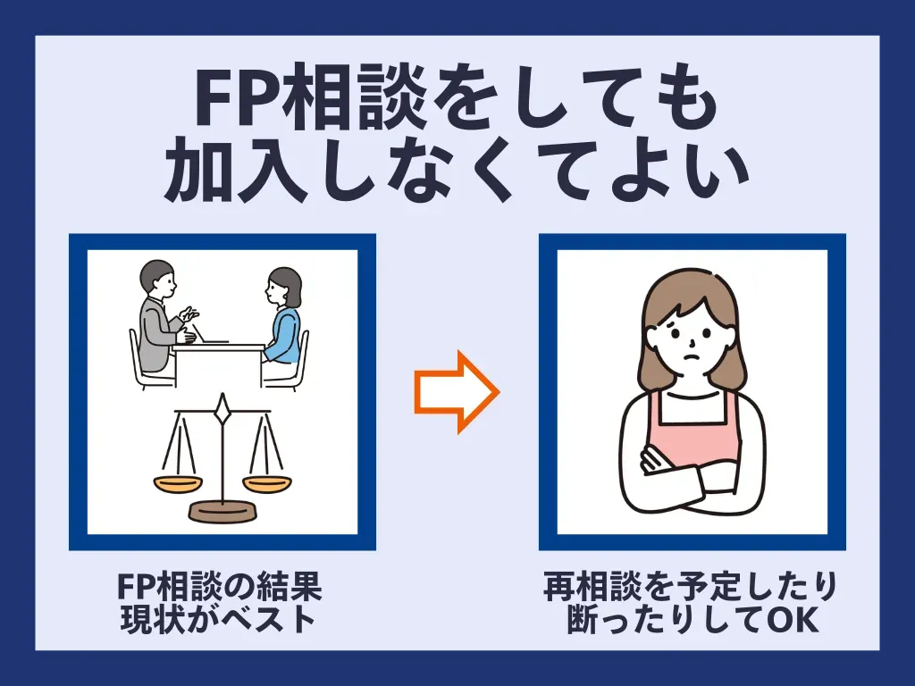 FP相談をするだけで、保険に加入しない方はたくさんいます。中には保険を見直すも現状がベストであることもあります。相談員はいくつかの提案をしますが、その内容に納得できない時は改めて相談を予定したり、断ったりしても問題ありません。