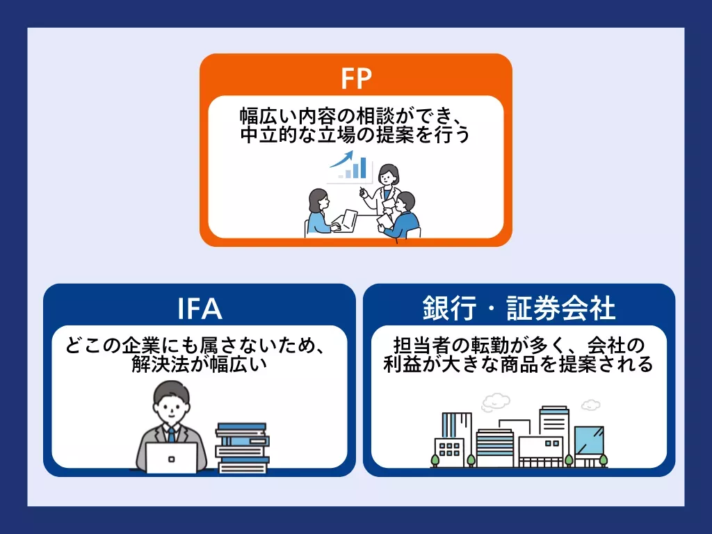 ここまで資産運用相談をするならFPがおすすめと述べてきましたが、相談先を調べる中で銀行やIFAの名前も聞いたことがあると思います。ここではそれぞれの特徴を比較してFP相談との違いを確認していきます。
