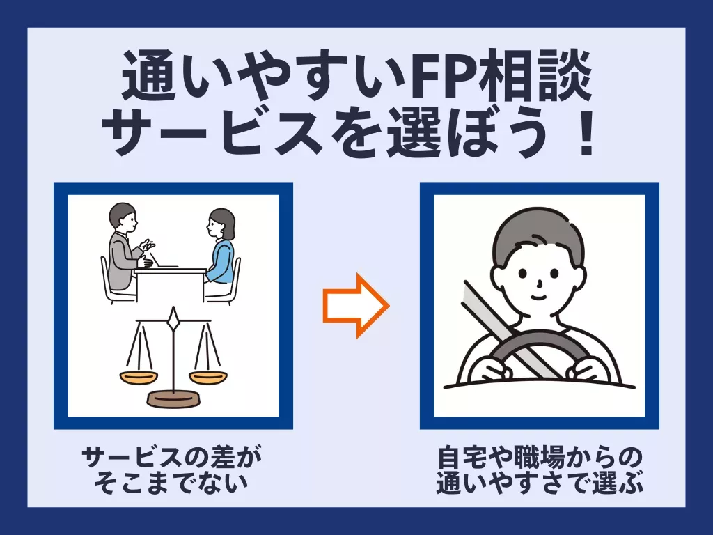 しかしその際、「通いやすさで選んでしまって本当にいいの?もっと自分に合ったFP相談サービスをしっかり探した方がいいのでは」という疑問が湧くと思います。そんな方も安心して下さい。資産運用相談が出来る主要のFP相談サービスではオンライン相談同様、様々なサポート体制やシステムが共通して導入されていることが多く、サービス間での差別化がしづらいため通いやすい資産運用相談サービスを選ぶのがおすすめです!