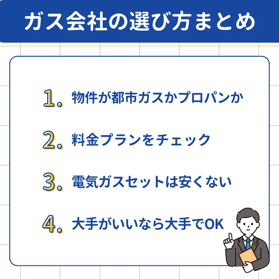 まとめると、都市ガスの場合は会社を変えても大きな失敗はしないため、比較的柔軟に会社の変更ができます。