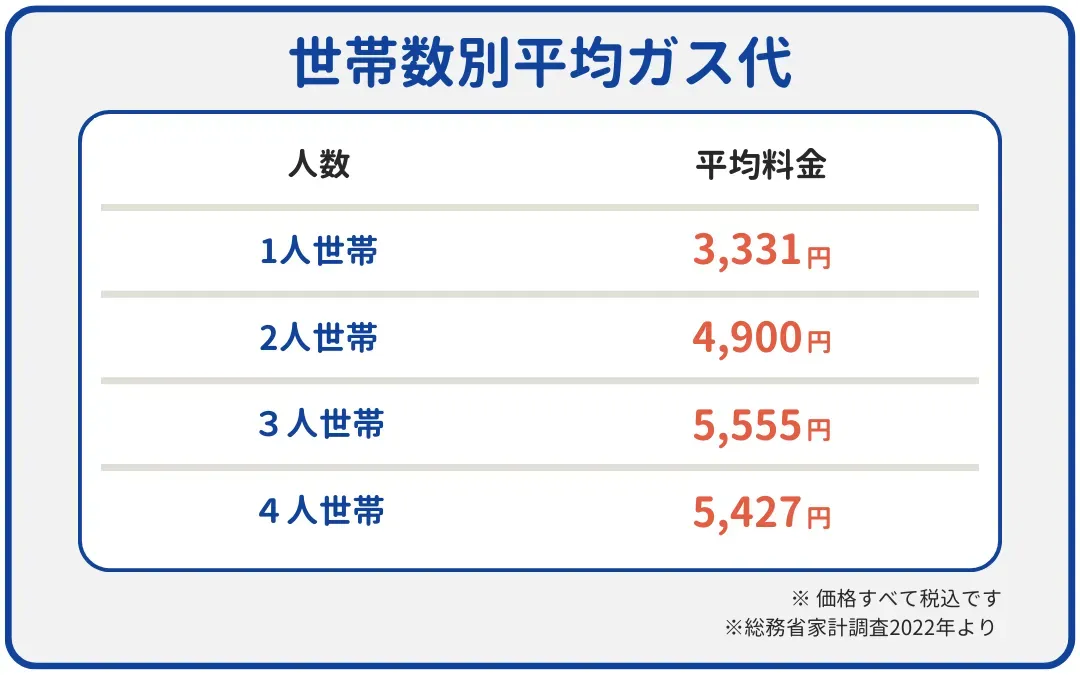 下記は世帯数別・季節ごとのガス料金の目安です。大きく数値から外れている場合は、料金の高い都市ガス会社と契約しているかもしれません。乗り換えを検討しましょう。