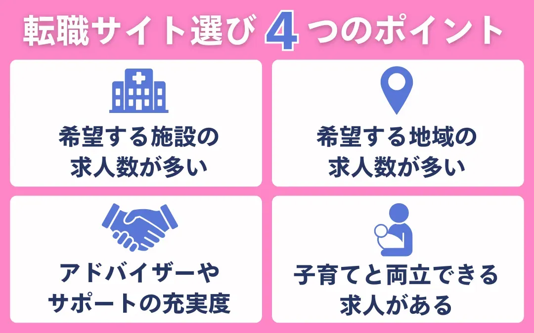 看護師転職サイトを選ぶ際には、託児所付きの職場や育児休暇制度が整っている職場、時短勤務が可能な求人がしっかり掲載されているかどうかも確認しておきましょう。