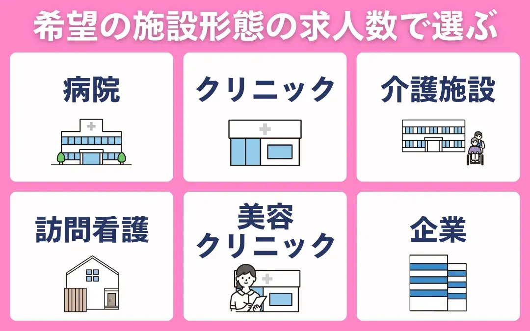 実は、看護師転職サイトごとに得意な職場(施設)の種類は異なります。「病院でキャリアアップしたい」「美容クリニックに転職したい」「訪問看護に挑戦したい」など、自分が希望する働き方に合った施設の求人が豊富にあるかどうかは必ずチェックしましょう。