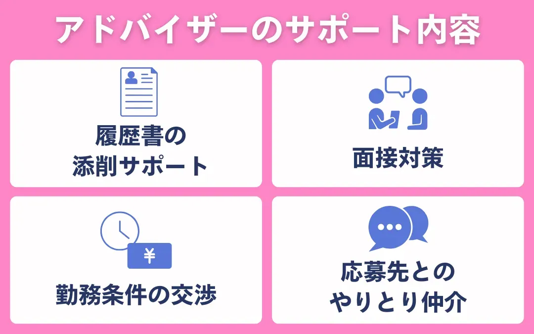 転職サポート | 面談、求人紹介、履歴書添削、 |